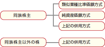 同族会社の株式の評価は原則として会社の業績や資産の内容を株価に反映させる原則的評価方法の「類 似業種比準価額方式」または「純資産価額方式」であり、この二つの方式の「併用方式」になります。 もう一つは、同族株主以外の少数株主で、ほとんど配当を受ける権利のみ株主ですから会社の配当金額 によって株価が計算される「配当還元価額方式」によります。