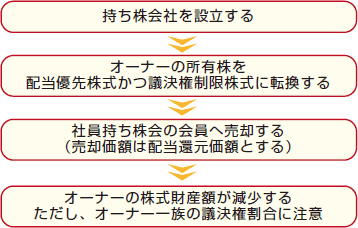 オーナー会社の株式財産を減らすための方法として、株価を引き下げる方法のほかに、オーナーが所有 している株式を減らす方法があります。その方法の一つとして、社員持株会の活用があります。 オーナー会社における事業承継の重要な要素の一つとして、経営支配権の問題があります。 オーナー一族での会社支配の功罪はあるでしょうが、同族会社での株式分散による多数株主の存在のほ うがもともと経営基盤の弱い非公開会社の中小会社においては問題が大きいと考えます。