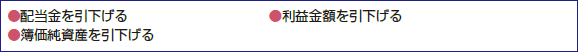 また、これらの要素のうち、自社の配当金、利益金額、簿価純資産価額は、低ければ低いほど、株価の 評価は下がることとなります。